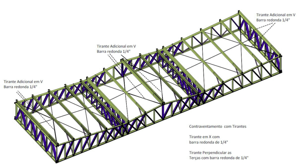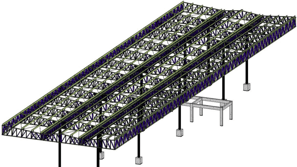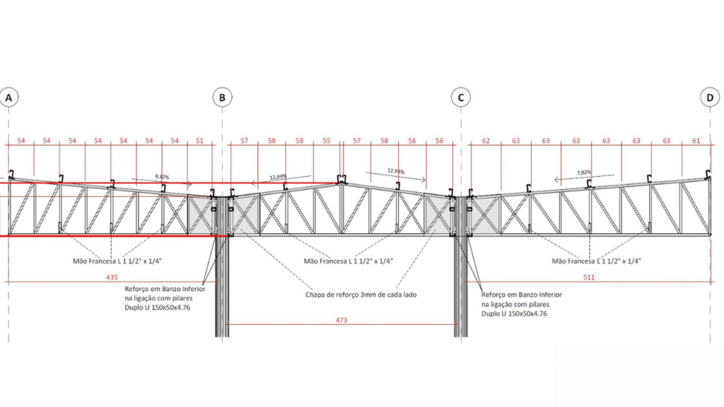 A cobertura foi projetada com vão principal de 12 metros entre pilares metálicos, além de balanços laterais de 5 metros em cada lado. Essa configuração exigiu soluções estruturais com grande eficiência e estabilidade, considerando ações permanentes, sobrecargas, vento e esforços de torção nos balanços.