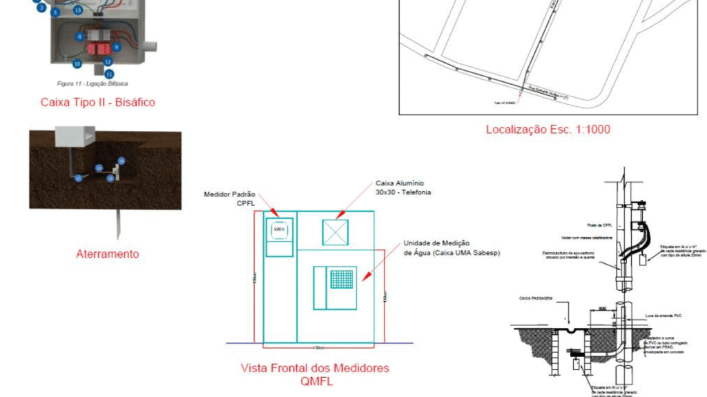 Projeto desenvolvido conforme as exigências da CPFL, com definição do ponto de entrega, eletrodutos de entrada, aterramento e quadro de medição instalado em caixa padrão da concessionária.