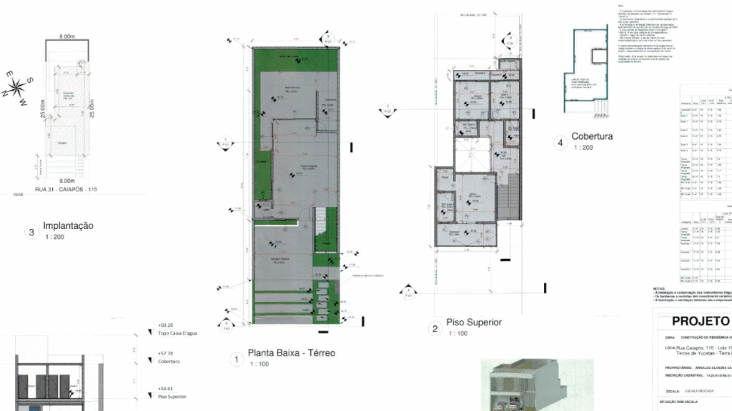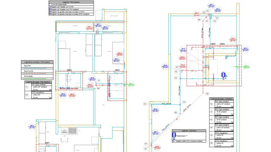 Projeto completo das instalações hidráulicas da residência, contemplando os sistemas de água fria, água quente, esgoto sanitário, águas pluviais e reservação superior.
