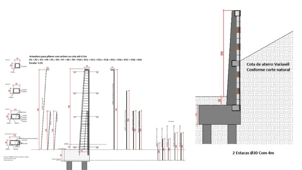 A nova contenção foi projetada com sistema de pilares de concreto armado em estilo contraforte, conectados por vigas de cintamento e com fechamento em alvenaria estrutural armada, o que confere ao conjunto estabilidade, rigidez e economia de materiais. A fundação foi dimensionada com blocos sobre estacas, garantindo a transferência segura das cargas para o solo firme, mesmo diante das condições instáveis do talude.