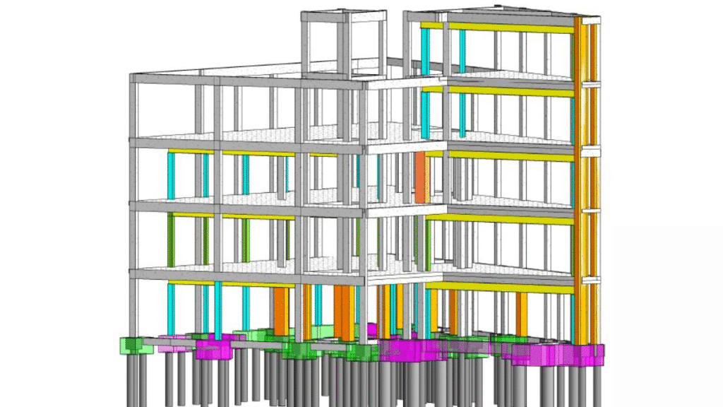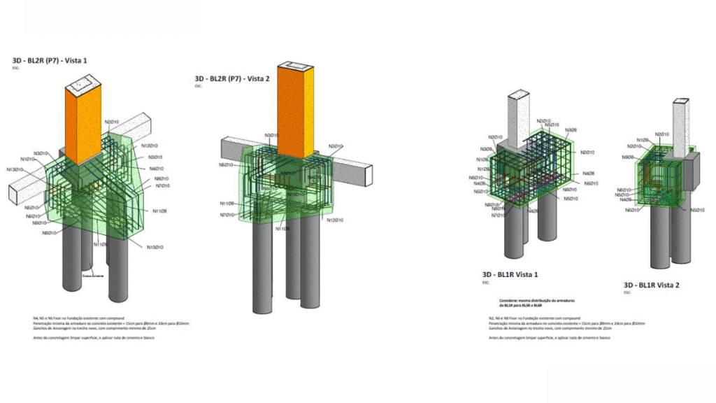 As imagens em 3D mostram não apenas o modelo da estrutura final reforçada, mas também os detalhes das armaduras, encaixes entre concreto e metálico, bem como o planejamento de etapas construtivas e escoramentos, indispensáveis para garantir estabilidade em situações críticas como essa.
